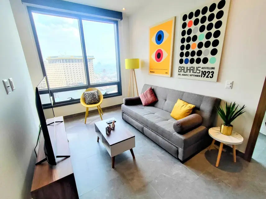 Bauhaus destaca por su amplitud y luminosidad, con un diseño moderno y minimalista que combina elegancia y comodidad. El departamento cuenta con una majestuosa cama king y un sofá cama doble en la sala de estar, perfecto para descansar después de un día explorando la ciudad. Las impresionantes vistas a la bulliciosa CDMX te acompañarán desde cada rincón del departamento.